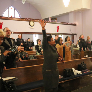 Goodie bags filled with candy were distributed to members of the Lockport Police Department. One by one, they formed a line at the front of the sanctuary to accept this offering.